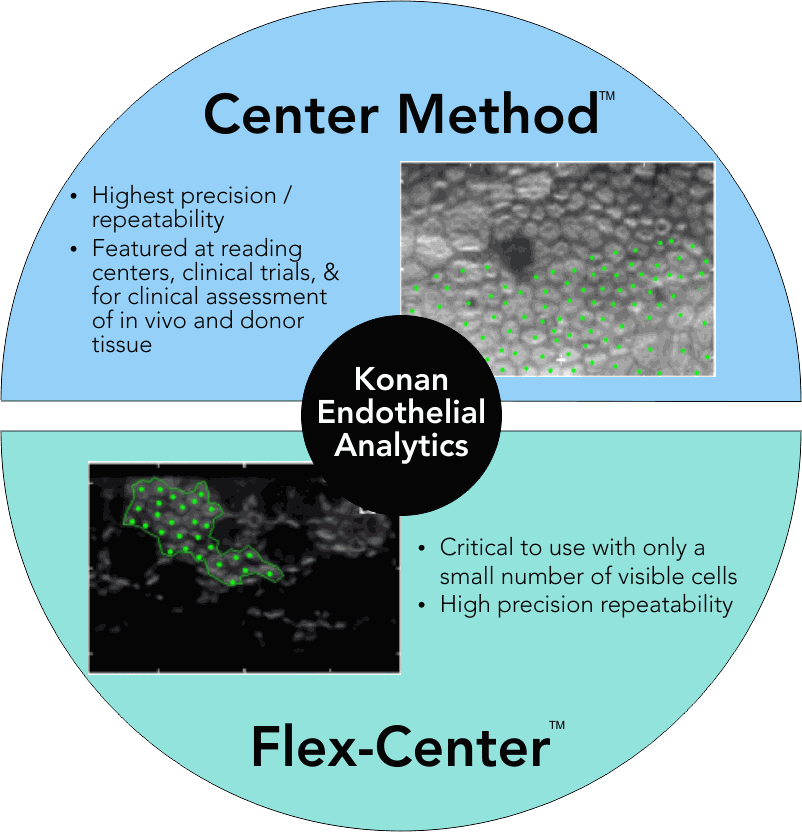 All Konan specular microscopes feature the Center Method of analysis. Center Method is mentioned in FDA panel minutes as being the “gold standard” and is used by virtually every professional reading center for independent assessment of corneal endothelial analytics. Unlike full-auto assessments, the Center Method provides high precision and repeatability for specular images in which relatively small continuous areas of visible cells are visible.