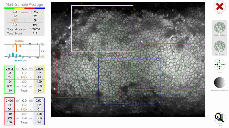 The Flex-Center method is the third tool for advanced stage diseased corneas in which only a very few numbers of cells are visible. With this semi-automated, perimeter-count method, again, high precision and repeatability is achieved. Only Konan provides the rich set of analytic tools for reliable assessment of the entire spectrum of corneal conditions.